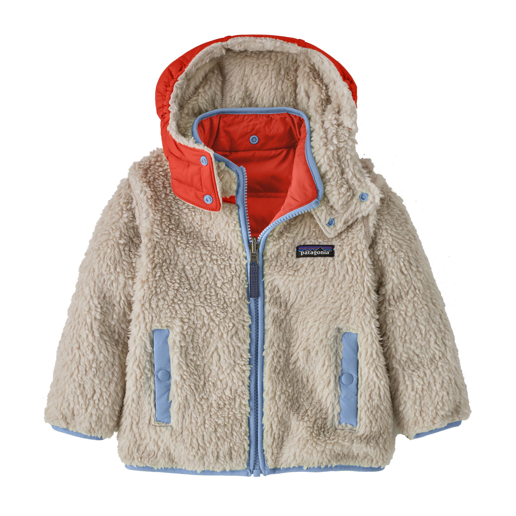 Snap-off hood attaches to both sides of the reversible jacket and has a snap-front closure; elastic binding along the hood opening provides a stay-put fit
